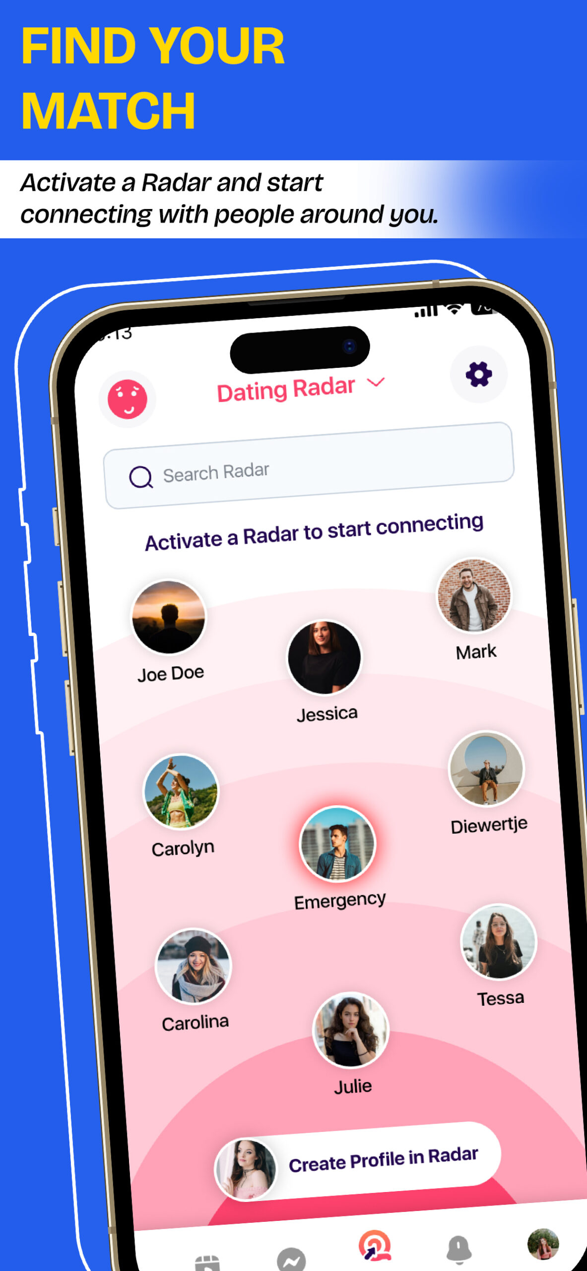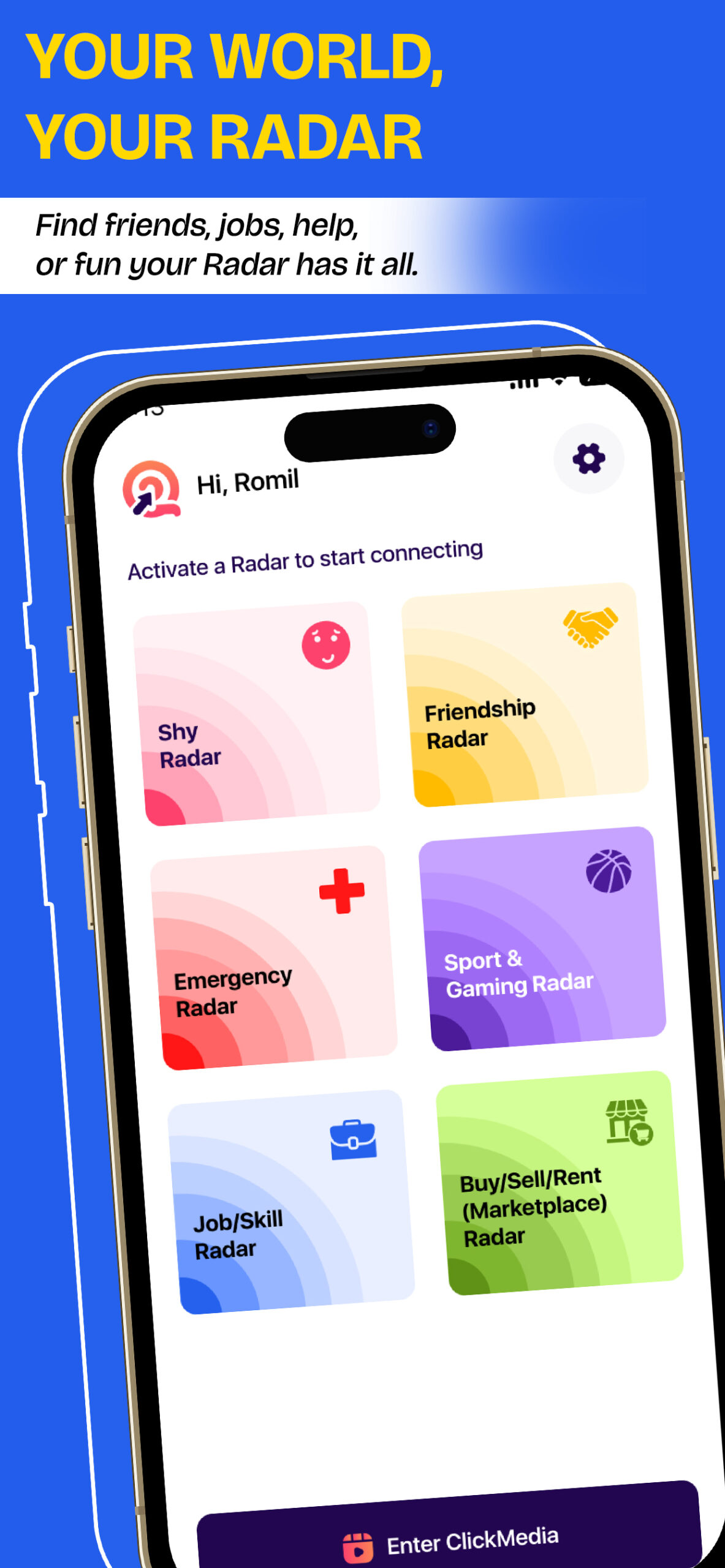 - Different types of radar like Friendship radar, Emaragancy radar, Game/Sports radar, Job skill radar, Buy/ Sell/ Rent radar, Shy radar.